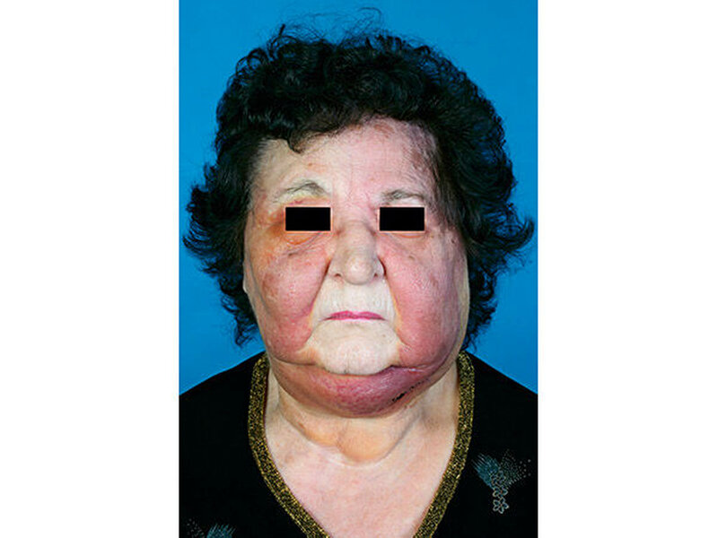 Eine 75-jährige Patientin, in gutem Allgemeinzustand und ohne relevante Nebendiagnosen, stellte sich mit einem ausgeprägten, schmerzhaften, rezidivierenden und bislang therapieresistenten, rötlichen Gesichtsödem der Gesichtshaut vor (Abbildung 1). Das Gesichtsödem trat erstmals nach einer Alveolarkammaugmentation mit bovinem Knochenersatzmaterial und der späteren Insertion von Zahnimplantaten im Ober- und im Unterkiefer acht Monate zuvor auf.