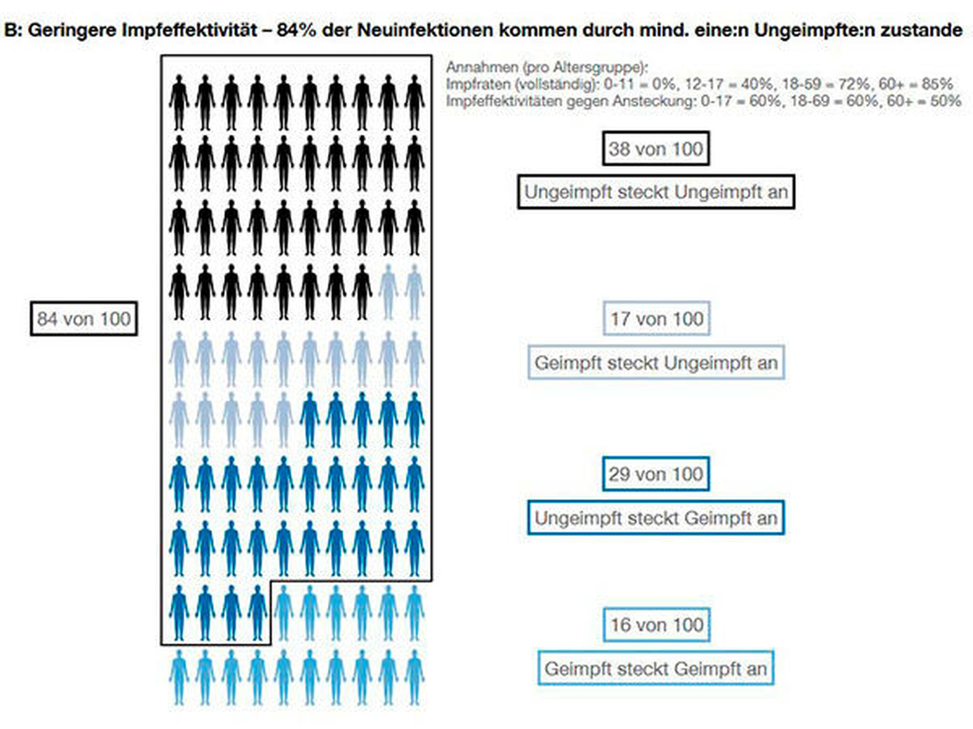 Daraus ergibt sich: Bei acht bis neun von zehn Ansteckungen ist mindestens eine Person ohne Impfschutz beteiligt – als Ansteckender, Angesteckter oder beides. Geimpfte spielen nur bei fünf bis sechs von zehn Ansteckungen eine Rolle. Je effektiver der Impfschutz, desto weniger Ansteckungen werden durch geimpfte Personen verursacht. Außerdem könnte man den R-Wert, also die effektive Reproduktionszahl, unter 1 drücken und die Pandemie zurückdrängen, wenn Ungeimpfte ihre Kontakte zwei bis drei Mal stärker reduzieren würden als Geimpfte.