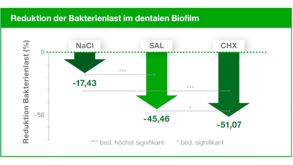 Salviathymol konnte den Anteil lebender Bakterien in der Plaqueprobe signifikant auf 54,54 % (Standardabweichung (SD) ± 2,53 %) reduzieren im Vergleich zu Kochsalzlösung (0,9%) (82,57 %, SD ± 3,49 %) (Abb. 1). Mit einer Differenz von 5,6% zu Chlorexidin (0,2%) als Goldstandard (48,93 % (SD ± 3,75 %)) konnte die Formulierung aus den ätherischen Ölen eine vergleichbare Wirkung auf die Biofilmaktivität zeigen.