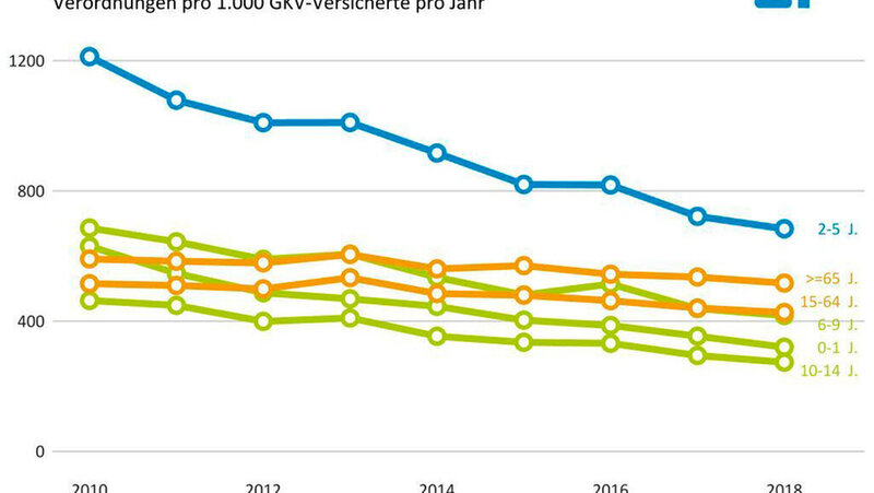 Wurden den GKV-Versicherten im Jahr 2010 noch 562 Verordnungen pro 1.000 Versicherte ausgestellt, waren es 2018 nur noch 446. Das ist ein Rückgang um insgesamt 21 Prozent, heißt es in der Studie. Besonders stark rückläufig (-41 Prozent) waren Verordnungen für Kinder und Jugendliche (Alterssegment 0-14 Jahre). Bei Neugeborenen und Säuglingen (0-1 Jahr) wurde der deutlichste Rückgang beobachtet. Hier hat sich die Verordnungsrate von 2010 bis 2018 fast halbiert: Von 630 Verordnungen im Jahr 2010 ging die Rate auf 320 Verordnungen pro 1.000 Versicherte im Jahr 2018 zurück (-49 Prozent).