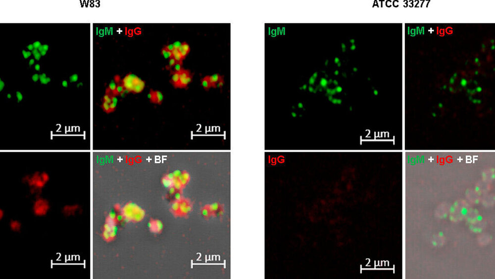 Im Rahmen ihrer Studie identifizierten die Wissenschaftler Immunglobulin-M-Antikörper (IgM), die sich gegen die OMVs von P. gingivalis richten. Sie fanden außerdem heraus, dass die IgM-Antikörper an die Zuckermoleküle (Glykane) der OMVs binden. Dabei erkennen die IgM-Antikörper eine für P. gingivalis spezifische Glykanmodifikation, die eine menschliche Zelle nicht produzieren könnte. „Indem wir diese spezifischen Glykan-tragenden OMVs verfolgen, können wir beobachten, ob und wohin OMVs von pathogenen bakteriellen Biofilmen in andere Körperteile gelangen“, sagt Dr. Hyun Young Kim, Erstautor des Artikels.