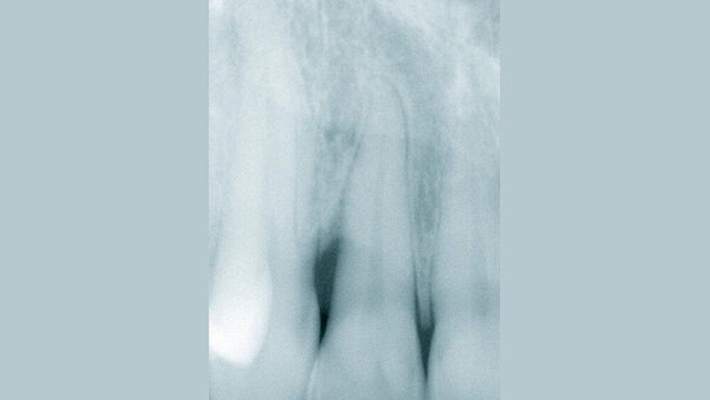 Ergebnis: Mithilfe der zusätzlichen Anwendung des mit Chlorhexidin beschickten Medikamententrägers konnte im Rahmen der gewählten unterstützenden Parodontitistherapie die parodontale Tasche lokal erfolgreich behandelt werden. Dies ist auch im Röntgenbild erkennbar (Abb. 4), das den radiologisch konsolidierten Knochenanbau am distalen Bereich deutlich zeigt.