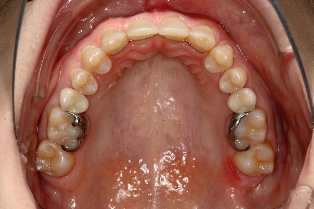 Vor der prothetischen Versorgung sollte zunächst eine kieferorthopädische Behandlung mit einer Ausformung der Zahnbögen mit Beseitigung des tiefen Bisses und regelrechter Einstellung der Zähne 13, 23, 15 und 25 erfolgen. Durch die regelrechte Einstellung der Eckzähne ergibt sich eine Lückenöffnung im Bereich der Nichtanlagen regio 12 und 22. Ein besonderes Augenmerk sollte auf eine symmetrische Einstellung der Lückenbreiten gelegt werden.