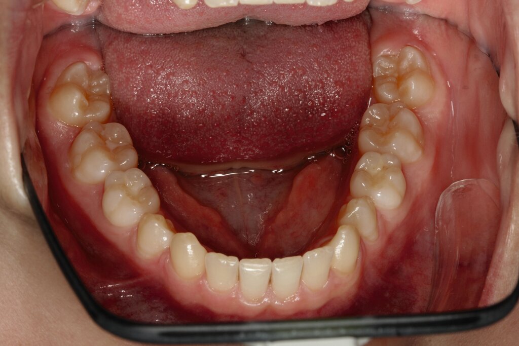 Im vorliegenden Fall stand der Zahn 23 bereits im Mesialstand bei hoher Lachlinie und tendenziell konkavem Lippenprofil. Bezüglich Morphologie und Farbe waren die Zähne 13 und 23 nicht ausgeprägt eckzahntypisch. Es bestand kein Platzmangel im Gegenkiefer. Die Patientin war bei der Erstdiagnose 12,5 Jahre alt und im Wechselgebiss der zweiten Phase mit atypischer Durchbruchreihenfolge. Es bestand eine geringfügige Klasse II. Der Overjet war vergrößert bei vertikaler Wachstumstendenz, der Overbite war um circa einen Millimeter vergrößert aufgrund der geringfügigen Steilstellung der Oberkiefer-Front. Es bestand der Verdacht auf Nichtanlage der Weisheitszähne, 15 und 25 waren verlagert.