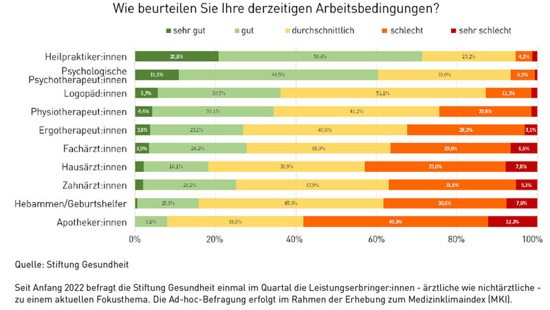 Die Ergebnisse sind ernüchternd: Lediglich zwei der zehn befragten Gruppen – die Heilpraktiker und die Psychologischen Psychotherapeuten – nehmen ihre Arbeitsbedingungen überwiegend als positiv wahr. In allen anderen Berufsgruppen zeigt sich die Lage erheblich verbesserungsbedürftig: „Bereits bei den Logopäden auf dem dritten Rang liegt der Anteil der positiven Wahrnehmung nur noch bei einem Drittel“, berichtet Prof. Konrad Obermann, Forschungsleiter der Stiftung Gesundheit. „Und bei den Apothekern am Ende der Skala sind es nicht einmal mehr zehn Prozent.“