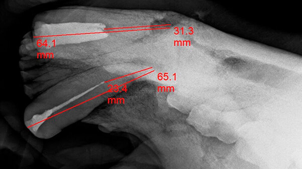 Drittens: Wurzelkanalbehandlungen an den Fangzähnen, den Dentes Canini, bedeuten aufgrund der extremen Länge von 70 bis 80 Millimetern bei großem Kanallumen eine enorme Herausforderung. Sie erfordern einen hohen Aufwand bezüglich der Darstellung und des „Flarings“ des gekrümmten Kanallumens mit Lindemannfräsen (60 Millimeter) und langen Wurzelkanalfeilen (75 bis 90 Millimeter), um die notwendige Arbeitslänge zu erreichen. Die elektrometrische Längenbestimmung funktioniert bei diesen Dimensionen nicht wirklich präzise, so dass man ohne eine Röntgen-Mess-Aufnahme zu einer fehlerhaften Längenabstimmung kommt.
