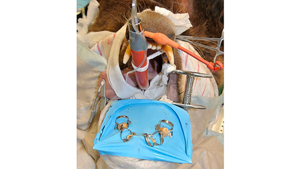 Es wird sofort begonnen, die zum Teil erheblichen Befunde zu priorisieren, um in der aktuellen Sitzung ein Maximum an Effekt im Sinne einer Gesundung zu erreichen. Zusammen mit den Tierärzten wird anhanddessen besprochen, wie lange der Patient in Narkose verbleiben darf und wie danach die Behandlung geplant und durchgeführt. Nach Lokalanästhesie zur zusätzlichen Schmerzausschaltung führen wir konservierend-chirurgische Leistungen durch.