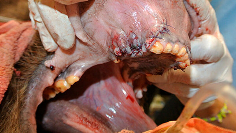 Die Tatzen werden durch Seile fixiert, um das Risiko von Verletzungen des Behandlungsteams durch Reflex- oder Krampfbewegungen der Tiere zu minimieren. Sobald das Tier in einer stabilen Narkose liegt, beginnen wir als zahnärztliches Team mit unserer systematischen Untersuchung. Extra- und intraorale entzündliche Schwellungen, Karies, Zahnfrakturen sowie Vernarbungen an Lefzen, Zunge und Wange durch gewaltsames menschliches Zutun (Ketten zum Halten der ehemaligen Tanzbären), Parodontitis und auch Raumforderungen im Sinne von Neubildungen sind typische Diagnosen.