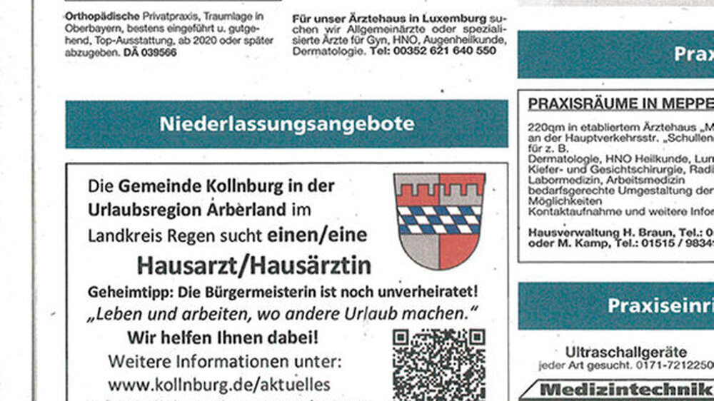 Wer sich für die Niederlassung in Kollnburg entscheidet, dem winken neben dem Status als Bürgermeistreinnengatte/ -gattin auch Praxisräume und Baugrund für 94 Euro pro Quadratmeter.