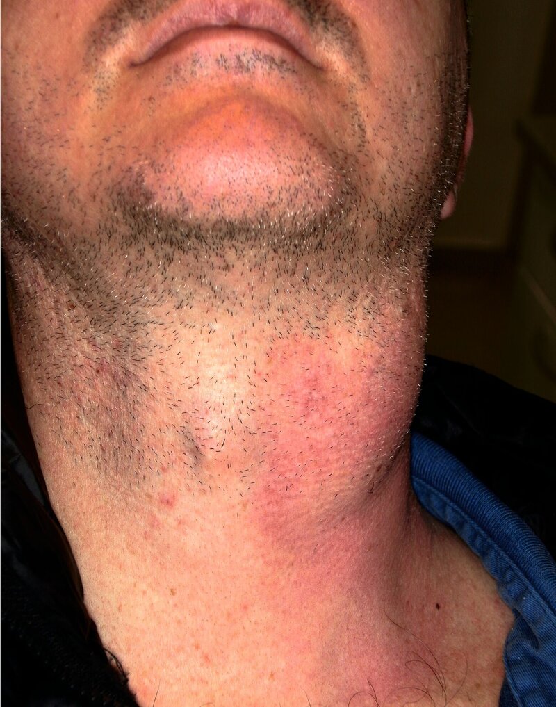 Der 43-Jährige erschien einige Tage nach seiner Konsultation bei einer niedergelassenen MKG-Chirurgin. Grund der Überweisung war die Bitte der Therapieübernahme aufgrund einer großen zervikalen Raumforderung. Die spezielle Anamnese zeigte, dass diese Raumforderung seit etwa zwei Jahren bestand.
