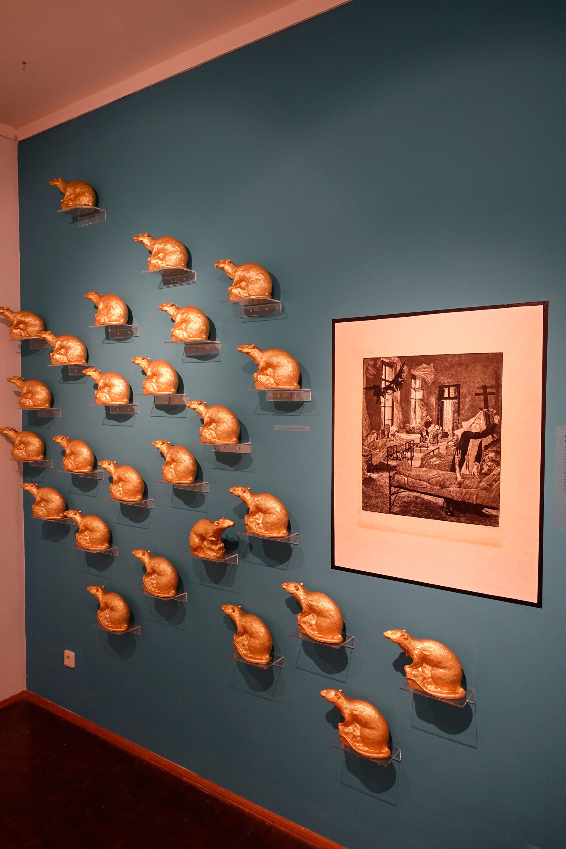 Eye-Catcher der Schau ist die Wandinstallation „Schlossratten“ von Ottmar Hörl. Direkt daneben hängt ein Blatt „Pest“ des Künstlers Max Klinger aus dem Jahre 1903. In einem Krankensaal kämpft eine Ordensschwester mit dem Rosenkranz gegen durch die aufgestoßenen Fenster hereinfliegende Raben, die den Tod bringen. Der Besucher mag sich bei der Darstellung an die überfüllten und sehr unter Stress stehenden Intensivstationen während der Covid-19 Pandemie erinnert fühlen.