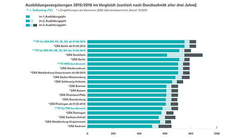 Stattdessen handelte der VmF auf Länderebene Tarifverträge mit einigen Bundesländern aus. Dazu gehören Hamburg, Hessen, das Saarland und Westfalen-Lippe. Dort erhielten die angehenden ZFA 2015 im ersten Ausbildungsjahr 710 Euro, im zweiten 750 Euro und im dritten 800 Euro monatlich an Gehalt. Um einen Überblick über die Vergütungen für ZFA in den Bundesländern ohne bestehende Tarife zu erhalten, fragt der VmF regelmäßig bei den Zahnärztekammern der Länder nach deren Empfehlungen (siehe Grafik).