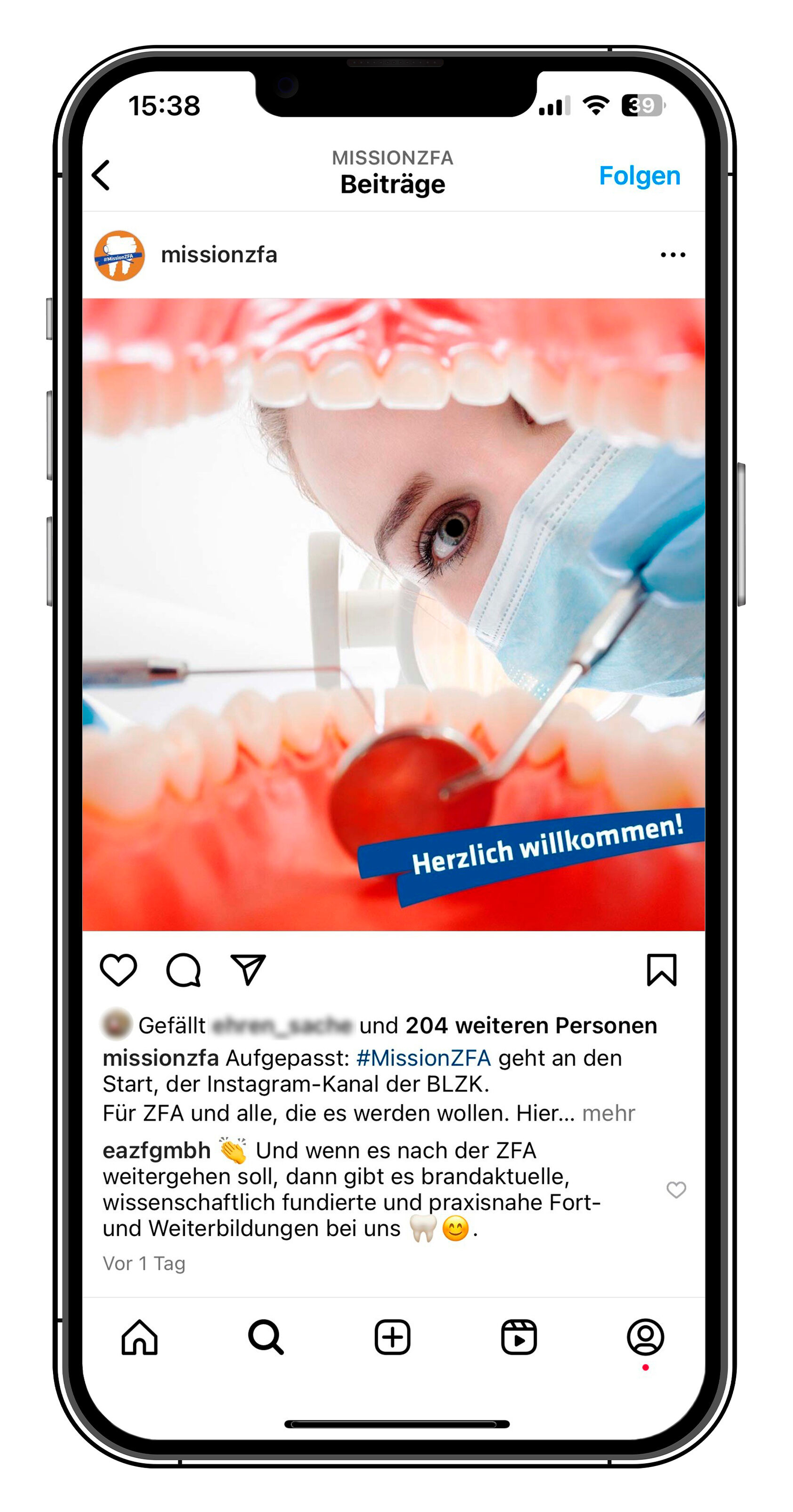 Wichtig sei der intensive Austausch und Dialog untereinander, betont die Vizepräsidentin der BLZK, Dr. Barbara Mattner: „Genau dafür haben wir unseren Instagram-Kanal ins Leben gerufen und möchten alle Interessierten bitten, MissionZFA zu liken, zu teilen und weiterzuempfehlen.“ Die Kammer nutze nun ein modernes Medium, um Inhalte auch zielgerichtet transportieren zu können.
