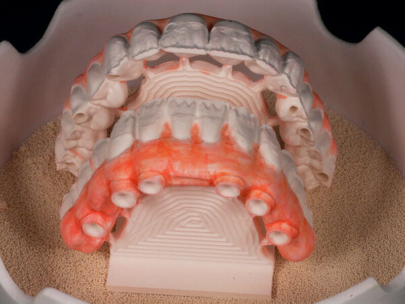 Für die Interimsphase verblieben zuerst nur die Eckzähne und jeweils ein Molar pro Quadrant. Auf Basis der Interimsprothese wurde eine 3-D-Diagnostik durchgeführt. Den gewünschten festsitzenden Zahnersatz setzten wir mit jeweils sechs Implantaten pro Kiefer um. Wir wählten ein konservatives Vorgehen mit geschlossener Einheilung, wobei der OK (12 Wochen Einheilungszeit) zuerst und dann der UK (8 Wochen Einheilung) operiert wurde. Zehn Tage nach der Freilegung erfolgte die erste Abformung. Im Unterkiefer verblieben die letzten Molaren bis zum Eingliedern des therapeutischen Provisoriums, um die Interimsprothese über gebogene C-Klammern so lange wie möglich zu verankern. Wir kombinierten eine analoge Vorgehensweise in der Praxis mit weitergehend digitaler Diagnostik, Planung und Umsetzung (CAD/CAM) im zahntechnischen Labor.