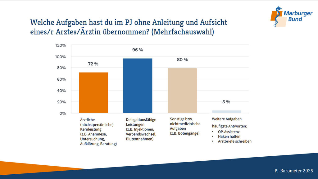 Rund 40 Prozent der Befragten gibt an, im ersten PJ-Tertial keine festen Ansprechpartner wie Mentorinnen oder Mentoren zu haben. Viele berichten, dass sie regelmäßig ärztliche Tätigkeiten ohne ausreichende Anleitung übernehmen und zugleich in erheblichem Umfang nichtmedizinische Aufgaben erledigen. Der Ausbildungsauftrag tritt dabei häufig in den Hintergrund.