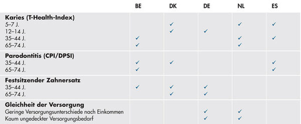Weitere Aspekte, die in der Studie detailliert untersucht wurden, hier aber nicht wiedergegeben werden können, sind beispielsweise der Umfang des zahnärztlichen Leistungskataloges, der Anteil der in den Sicherungsschutz einbezogenen Bevölkerung sowie die Höhe der Patientenzuzahlungen, außerdem der (barrierefreie) Zugang zur Versorgung, das Ausmaß des ungedeckten Versorgungsbedarfes sowie etwaige Versorgungsdisparitäten.