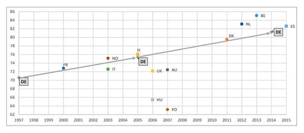 Letztlich kamen somit lediglich 5 der 32 Länder für einen Vergleich der zahnmedizinischen Versorgungssysteme infrage. Vor allem die fehlende Aktualität führte zum Ausschluss vieler ansonsten geeigneter Vergleichskandidaten. Der oralepidemiologisch in vielen Ländern nachweisbare sakuläre Trend der Kariesreduktion (Caries decline) zeigt beispielhaft, dass es wenig Sinn macht, die Mundgesundheit des Landes A mit der Mundgesundheit des Landes B zu vergleichen, wenn die Daten im Land B zehn Jahre vor denen im Land A erhoben wurden (Abbildung 1).