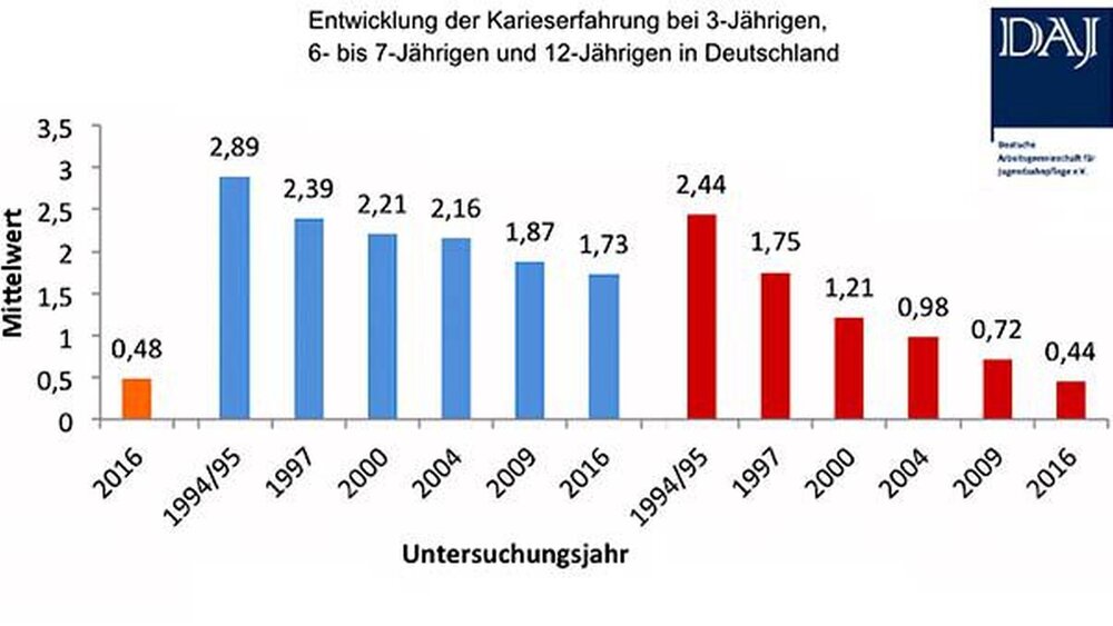 Die Werte sind die besten, die in Deutschland jemals erreicht wurden. Bei den 3-jährigen Kindergartenkindern hingegen herrscht Nachholbedarf: Eine kleine Gruppe von Kleinkindern hat starken Kariesbefall – damit gibt es sehr früh eine soziale Polarisation der Karies. Diese Altersgruppe wurde erstmals im Rahmen der DAJ-Studie untersucht.