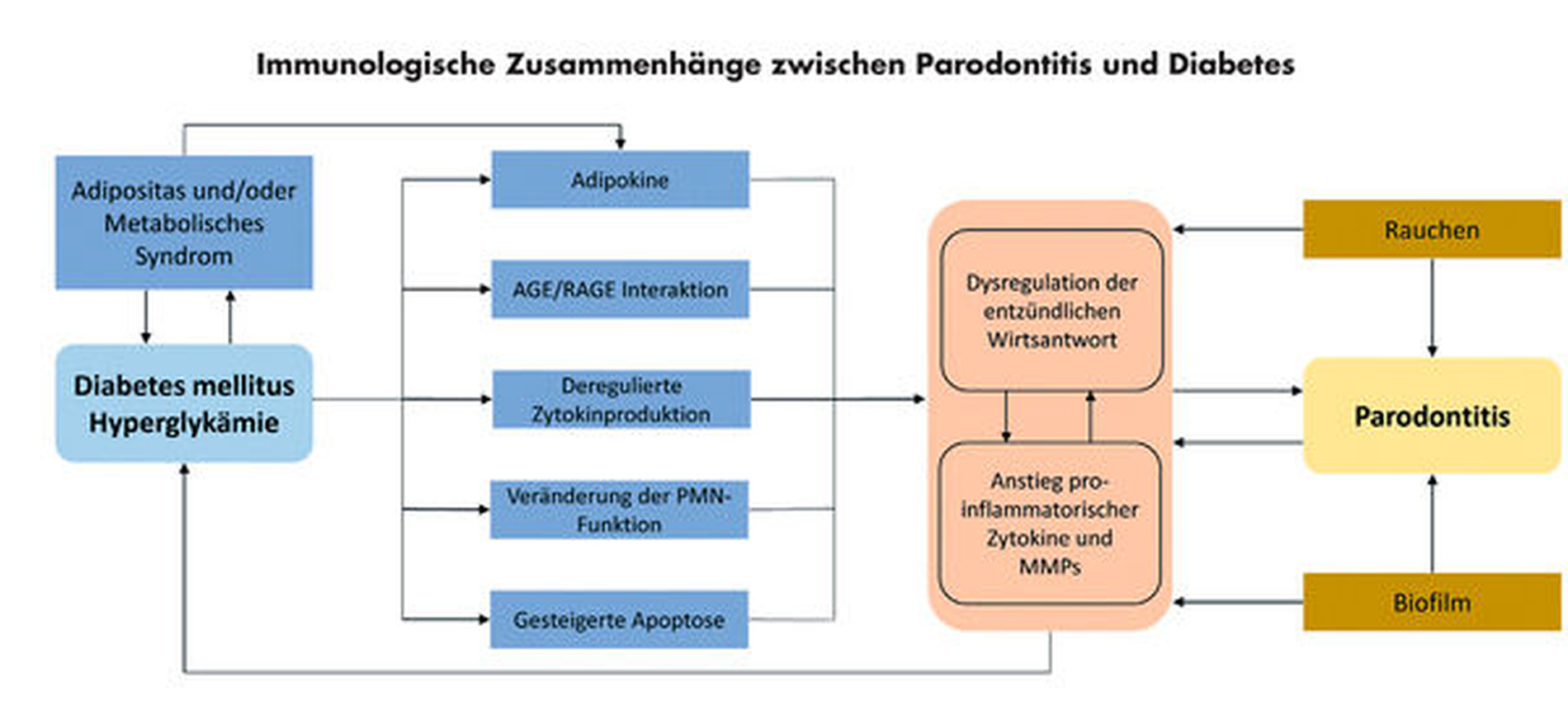 Durch den erhöhten Glukoseanteil im Blut bei einem insuffizient eingestellten Diabetiker, kommt es zur nichtenzymatischen Glykosylierung (Anbindung von Zucker an Nicht-Zucker-Verbindungen) von Proteinen, was zur Bildung von sogenannten Advanced Glycation End Products (AGE) führt. Binden diese AGE an ihren RAGE-Rezeptor auf Monozyten, kommt es zur verstärkten Produktion und Ausschüttung inflammatorischer Mediatoren, insbesondere IL-1β, TNF-α und IL-6 [Lalla et al., 2001]. Zudem sind die AGE an der Entstehung von oxidativem Stress in Endothelzellen und PMN beteiligt [Vlassara, 2001; Wong et al., 2003]. Weiterhin haben AGE einen Effekt auf den Knochenstoffwechsel, insbesondere auf eine verschlechterte ossäre Heilung und Störung der extrazellulären Matrix [Santana et al., 2003; Cortizo et al., 2003]. Insgesamt kommt es durch die Bildung von AGE zur verstärkten Inflammation, zu oxidativem Stress, zur Störung der Vaskularisation (Mikroangiopathien) sowie zur Beeinflussung des Knochenstoffwechsels, was sich in der Summe auf die Schwere und die Ausprägung parodontaler Erkrankungen auswirkt. Darüber hinaus beschreiben aktuelle Studien weitere Aspekte, wie die mögliche Rolle einer mitochondrialen Dysfunktion, einer Autophagie sowie den Cross-talk zwischen Adenosin Monophosphat-aktivierter Proteinkinase (AMPK) und dem Renin-Angiotensin System (RAS) [Portes et al., 2021]. Hier ergibt sich eine spannende Perspektive für die weitere Untersuchung der Kausalzusammenhänge beider Krankheitsbilder.