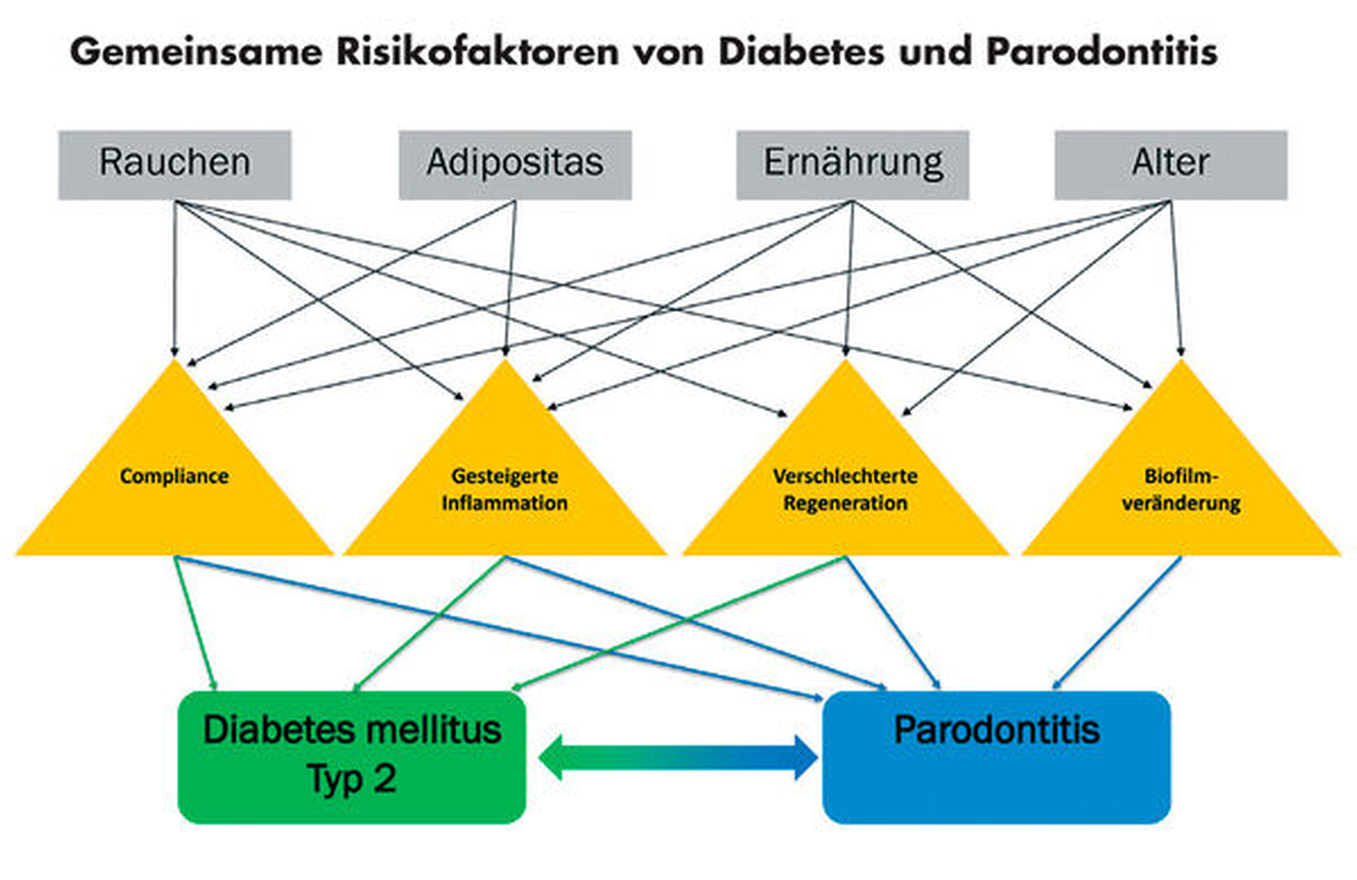 Chronische Erkrankungen der Zähne und des Zahnhalteapparats haben auf Patientenebene einige Gemeinsamkeiten zum Diabetes mellitus: So handelt es sich um Zivilisationserkrankungen, die durch zahlreiche erworbene Faktoren beeinflusst werden können. Es ist daher nicht verwunderlich, dass Patienten mit einer Parodontitis und/oder einer Diabeteserkrankung einen gemeinsamen Risikokomplex aufweisen. Grundsätzlich sind sowohl Diabetes (Typ II) als auch Parodontitis überwiegend Lebensstil-assoziierte Erkrankungen. Hierbei spielen unter anderem eine ungesunde Ernährung und damit einhergehend Adipositas eine bedeutende Rolle. Aber auch ein erhöhter Alkoholkonsum, Rauchen und verminderte Bewegung stellen mögliche Risikofaktoren dar. Zudem sind häufiger Patienten im fortgeschrittenen Alter von einer oder beiden Erkrankungen betroffen [Borgnakke, 2016; Negrato et al., 2013]. Auf der anderen Seite weisen Patienten mit diesen Erkrankungen oftmals eine mangelnde Compliance und/oder Adhärenz auf [Kneckt et al., 2000; Kim et al., 2013].