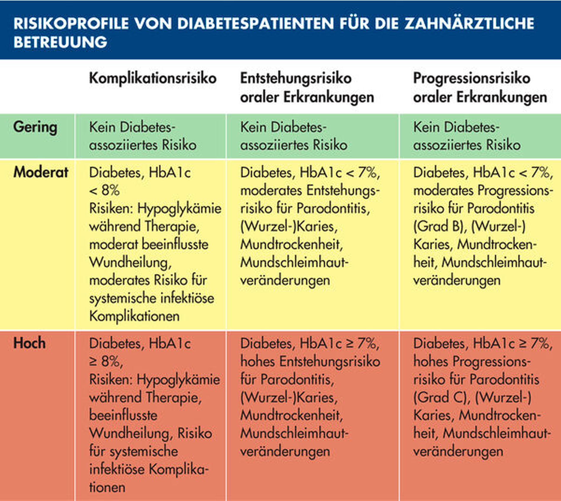 Um klinische Konsequenzen im Rahmen eines patientenorientierten Betreuungskonzepts für diese komplexen Patientenfälle zu erarbeiten, soll abschließend kurz das spezifische Risikoprofil von Diabetespatienten zusammengefasst werden: Entsprechend des Konzepts der individualisierten Prävention müssen hierfür Komplikations- und Erkrankungsrisiken bewertet werden [Schmalz und Ziebolz, 2020]. Ein Komplikationsrisiko besteht dann, wenn aufgrund der zahnärztlichen Behandlung ein Gesundheitsschaden für den Patienten entstehen kann. Dies liegt beim Diabetes dann vor, wenn Patienten (lang andauernd) schlecht eingestellt sind (HbA1c > 8,0 Prozent) und beinhaltet insbesondere das Risiko systemisch infektiöser Komplikationen. Erkrankungsrisiken sind wiederum Prädispositionen für das Auftreten (Entstehungsrisiko) oder Voranschreiten (Progressionsrisiko) von oralen Erkrankungen [Schmalz und Ziebolz, 2020]. Im konkreten Fall haben Diabetiker (wie beschrieben) ein erhöhtes Erkrankungsrisiko für Karies und/oder Parodontitis, das ebenfalls von der glykämischen Einstellgüte abhängig ist (Tabelle 3). Da sich bei Diabetespatienten oftmals verschiedene Risiken akkumulieren, ist die detaillierte Betrachtung und Bewertung aller Risikofaktoren bedeutsam, um auch komplexe Patientenfälle adäquat auflösen zu können (Abbildung 5).