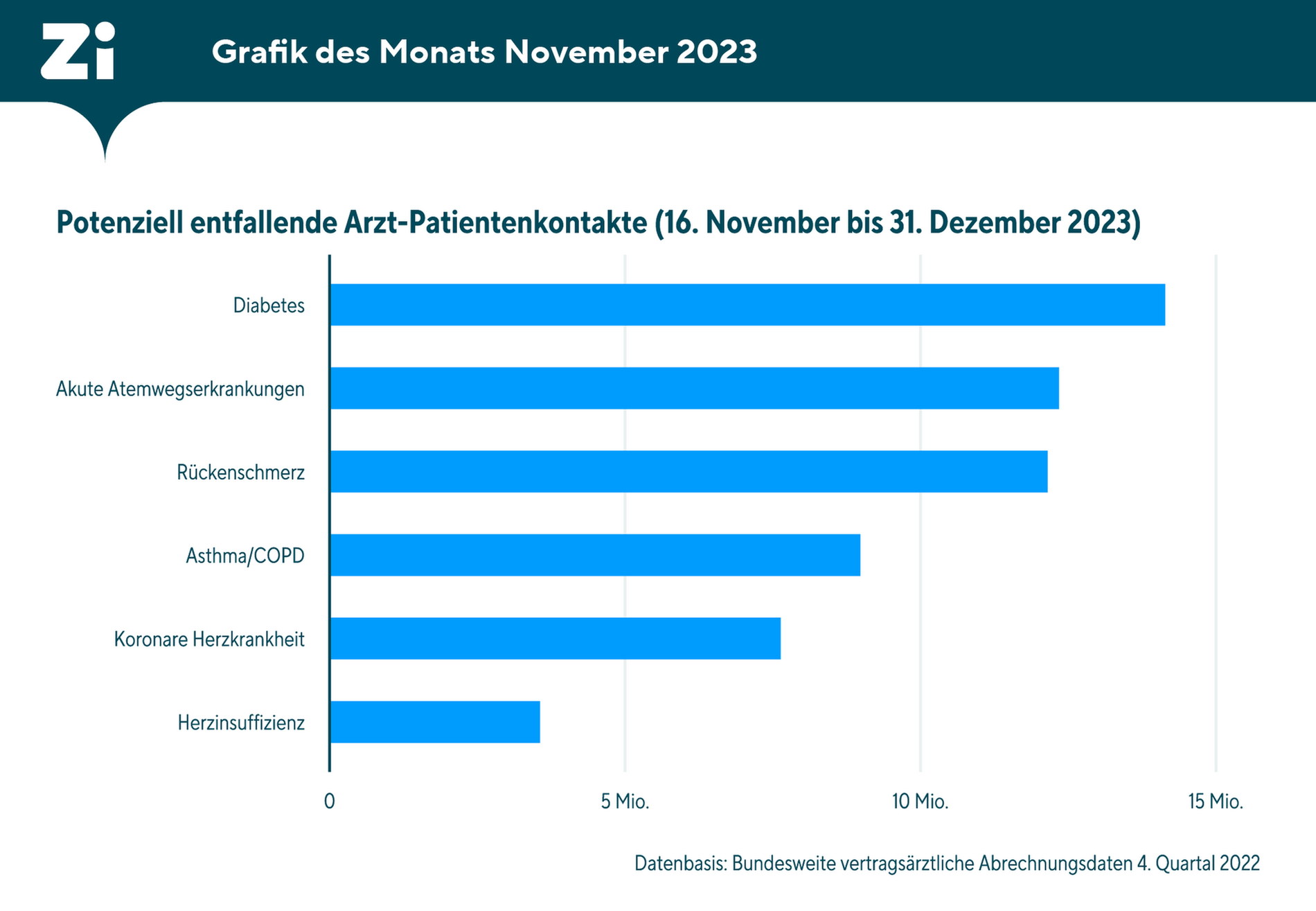 Allein bei Kindern und Jugendlichen wären dies mehr als zehn Millionen entfallende Arzt-Patienten-Kontakte. In der Altersgruppe der 50- bis 69-Jährigen wären es mehr als 41 Millionen und bei den Älteren ab 70 Jahren rund 32 Millionen – davon etwa zwei Millionen Kontakte von Heimbewohnern. Besonders stark betroffen wären chronisch Kranke Patienten. So schätzt das Zi, dass 14 Millionen terminierte Praxisbesuche bei Diabetikern, 12 Millionen aufgrund von Rückenschmerzen, rund neun Millionen wegen Asthma oder chronisch obstruktiver Lungenerkrankung (COPD) und mehr als sieben Millionen aufgrund von koronaren Herzkrankheiten nicht mehr stattfinden könnten.