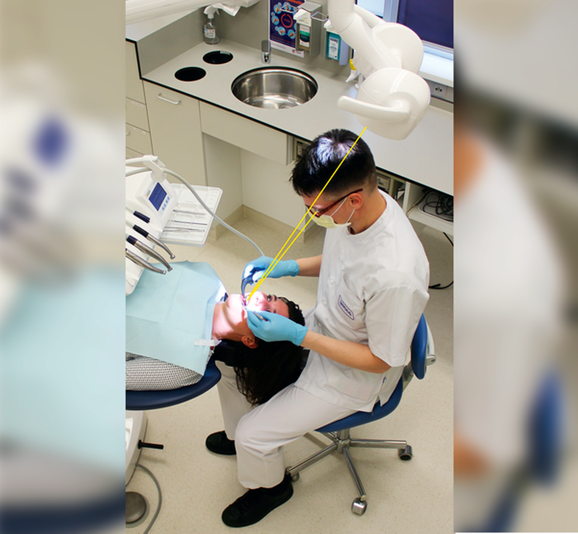 Eine zentrale Rolle spielt auch die Beleuchtung. Eine gut eingestellte Lichtquelle über der Behandlungseinheit, die den Mundraum des Patienten ideal ausleuchtet, trägt neben einer allgemein guten Raumbeleuchtung zu einer besseren Arbeitshaltung bei. Der Körper muss sich dann nicht verrenken, um dem Schatten auszuweichen. Dabei sollte die Raumbeleuchtung etwa die Intensität von Tageslicht haben und der Strahl der Behandlungsleuchte parallel zum Sehstrahl ausgerichtet sein (Abbildung 3). „Der Kontrast der beiden Lichtquellen sollte nicht zu groß sein, sonst wird es für das Auge zu anstrengend“, betont Rotgans. „Mit einer passenden Lupenbrille oder Prismenlupenbrille (beispielsweise Bajohr), mit der man um die Ecke gucken kann, wird eine haltungsschonende Arbeitsweise besser möglich.“