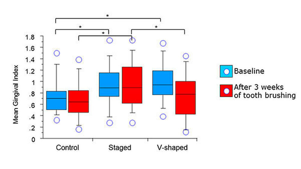 Ergebnisse:Bei den Probanden mit der V-Anordnung zeigte sich eine statistisch signifikante Verbesserung der Mundhygiene. Dagegen konnte bei der 2-Level Bürste im Vergleich zur Kontrollgruppe kein Unterschied festgestellt werden. Nach den 48 Stunden ohne jegliche Mundhygiene wurde allerdings kein Unterschied in den drei Gruppen festgestellt. Zwei Teilnehmer mussten ausgeschlossen werden.