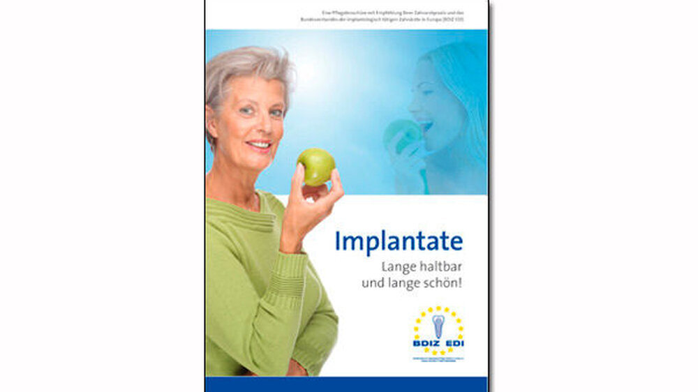 Pflegebroschüre des BDIZ EDI für Zahnarztpraxen zur Weitergabe an Patienten„Implantate – lange haltbar und lange schön“A4-Format, 24 Seiten, 32 AbbildungenPreis: 1,50 € (Mindestabnahme 10 Stück zzgl. Versand)Bezug: BDIZ EDI, An der Esche 2, 53111 Bonnoffice-bonn@bdizedi.orgTel. 0228-935 92 44