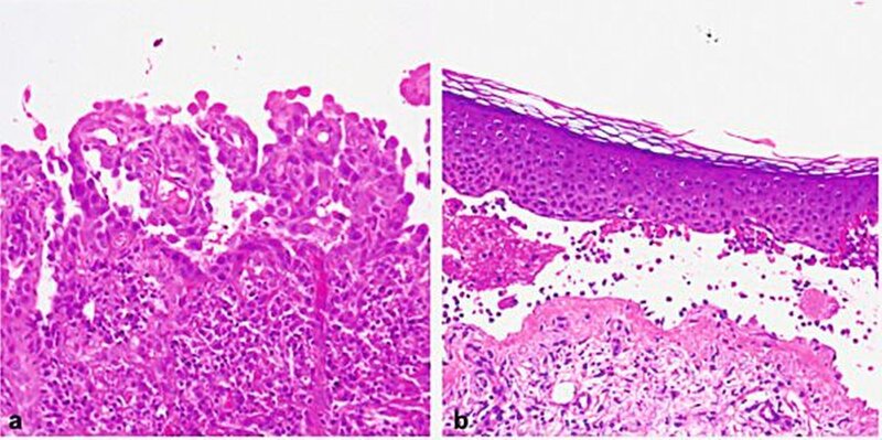 Durch die histologische Untersuchung einer läsionalen Probebiopsie kann man die Ebene der Spaltbildung identifizieren. Die histologische Untersuchung erfolgt mittels einfacher Hämatoxylin-Eosin (HE)-Färbung. Die Pemphiguserkrankungen zeigen eine intraepidermale Spaltbildung und Akantholyse (Abbildung 7a), während die Pemphigoiderkrankungen eine subepidermale Spaltbildung (Abbildung 7b) aufweisen. Eine sichere Differenzierung zwischen den verschiedenen Pemphigoiderkrankungen ist allein anhand der histopathologischen Untersuchung nicht möglich [Schmidt und Zillikens, 2016]. Die Histologie ist vor allem dann hilfreich, wenn die direkte IF sowie die serologische Untersuchung negativ sind, eine bullöse AID daher nicht vorliegt und Differenzialdiagnosen erwogen werden müssen (siehe unten).