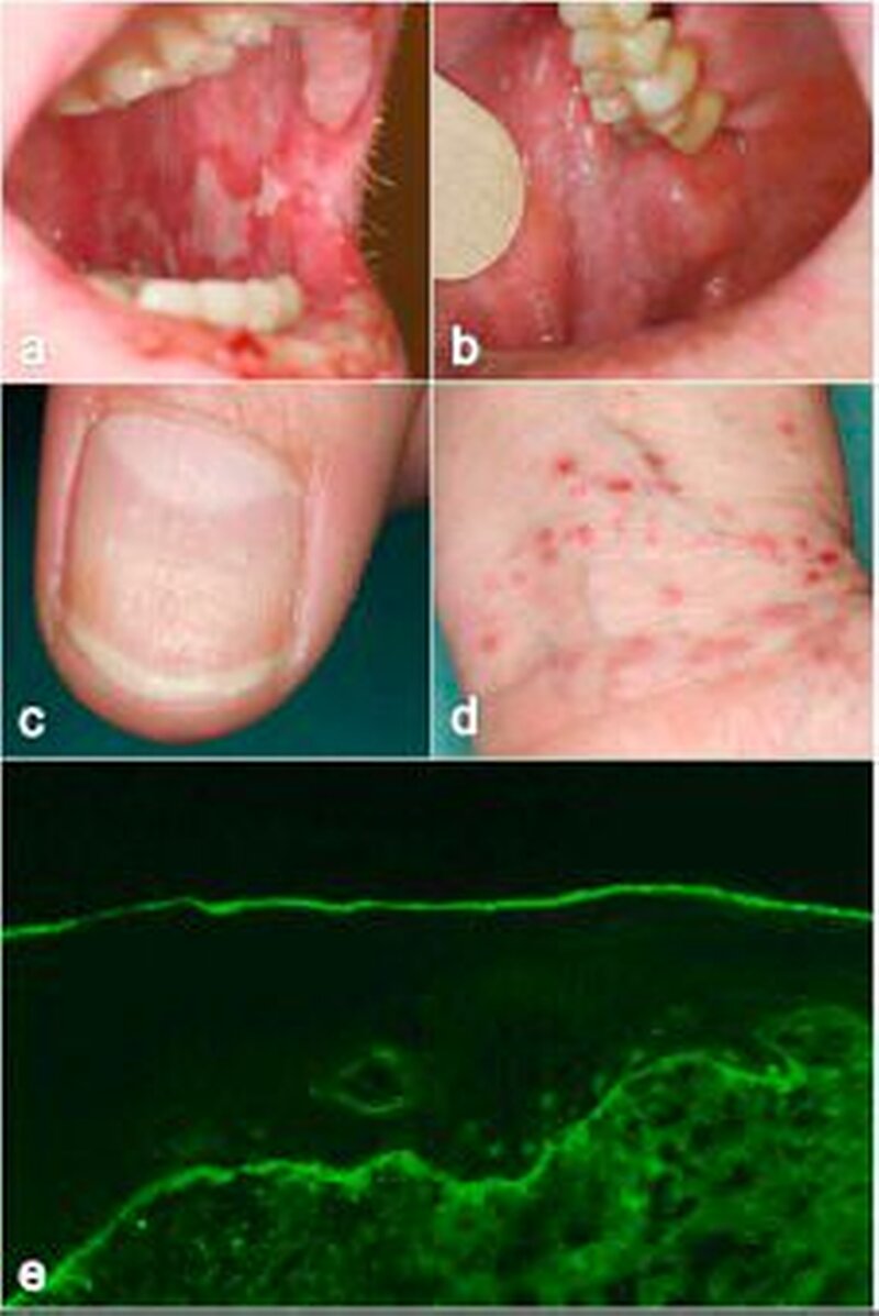 Ein Lichen ruber mucosae kann sich mit flächigen Erythemen, Erosionen und Ulzera der Mundschleimhaut manifestieren (Abbildung 10a). Typischerweise sind Wangenschleimhaut, Zunge und Lippen betroffen. Nicht selten findet sich eine weißliche, streifige oder netzförmige Zeichnung an der Wangenschleimhaut (Wickhamsche Streifung) (Abbildung 10b). Extramukosale Prädilektionsstellen des Lichen ruber sind Kapillitium (vernarbende Alopezie), Nägel (Abbildung 10c) und Handgelenkinnenseiten (stark juckende, polygonale Papeln; Abbildung 10d). In der direkten IF einer periläsionalen Biopsie zeigen sich typischerweise Cytoidkörperchen sowie bandförmige Ablagerungen von Fibrinogen an der Basalmembran mit netzförmigen Ausläufern in die obere Dermis [Schmidt und Zillikens, 2016] (Abbildung 10e).
