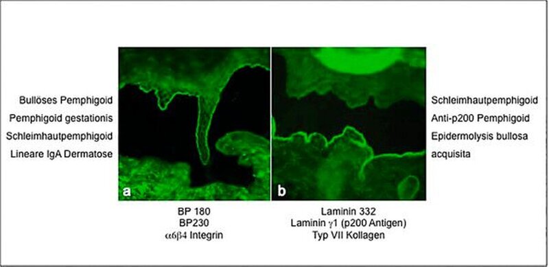Autoantikörper gegen BP180, BP230 und α6β4-Integrin binden am Blasendach (Abbildung 9a). Antikörper gegen Laminin 332, p200 Antigen/ Laminin γ1 und Typ VII Kollagen am Blasenboden (Abbildung 9b). Bei der Dermatitis herpetiformis Duhring binden IgA-Autoantikörper gegen das Endomysium der glatten Muskulatur des Affenösophagus.