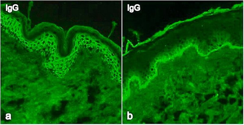 Entscheidend für die Diagnose ist die korrekte Entnahme von zwei Biopsien, wobei eine aus der zu untersuchenden Läsion und die andere aus der angrenzenden gesunden Schleimhaut/Haut entnommen werden sollte. Die molekulare Identifizierung der meisten Zielantigene wurde durch die Entwicklung kommerzieller Testsysteme für IgG-Antikörper gegen die Hauptzielantigene Desmoglein 3, Desmoglein 1, Envoplakin, BP180 NC16A, BP230 und Typ VII Kollagen möglich (Tabelle 2).