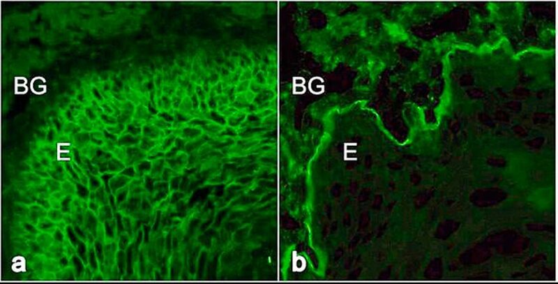 Immunpathologisch ist das Vorliegen von Autoantikörpern gegen Desmoglein 3 charakteristisch. Die Diagnose erfolgt durch den Nachweis von interzellulären IgG- Ablagerungen im Epithel in der direkten IF einer periläsionalen Biopsie der Mundschleimhaut (Abbildung 4a).