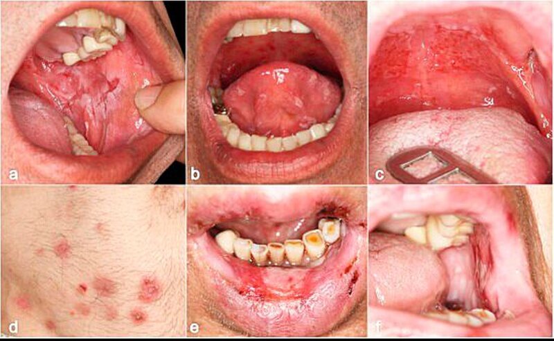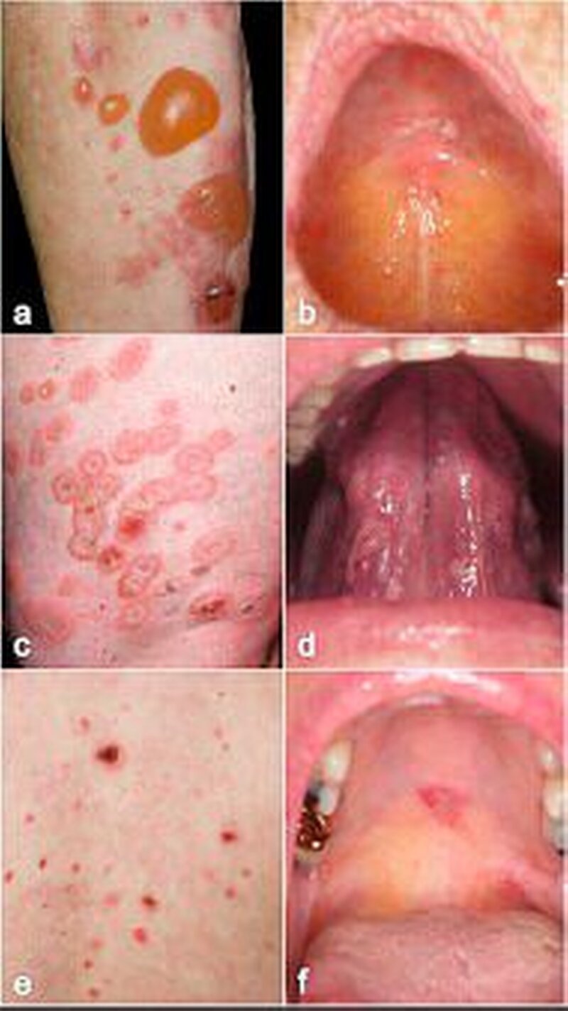 Daneben können Pharynx, Larynx und Ösophagus sowie die genitale und die perianale Schleimhaut erkranken. Im Lauf der Erkrankung breiten sich die Läsionen oft mit schlaffen Blasen und Erosionen auf die Haut aus. Die Blasen reißen wegen der dünnen Blasendecke rasch ein, so dass sich Erosionen und Krusten bilden (Abbildung 3d).
