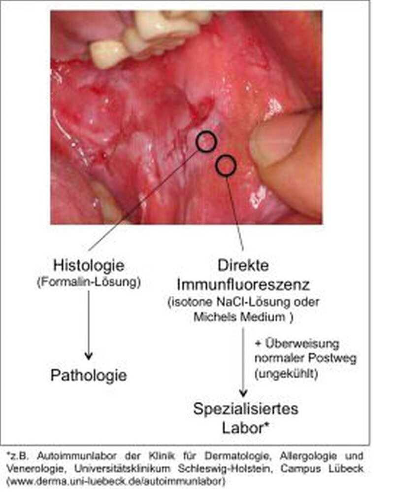 Die periläsionale Biopsie für die direkte IF wird in isotone Kochsalzlösung oder Michels-Medium gegeben und kann dann ungekühlt mit normaler Post an ein spezialisiertes Labor geschickt werden [van Beek et al., 2012]. Das Autoimmunlabor der Hautklinik Lübeck ist akkreditiert (DAkkS D-ML-13069–06–00) und bietet die Durchführung der direkten IF einer Mundschleimhautbiospie an. Es kann derselbe Überweisungsschein wie für die Histologie verwendet werden. Einsendescheine und -medium können bei Bedarf angefordert werden (www.derma.uni-luebeck.de/autoimmunlabor). Die zweite, läsionale Biopsie ist für die histopathologische Untersuchung vorgesehen, wird in Formalin-Lösung gegeben und entweder zusammen mit der ersten Biopsie ins Speziallabor oder – wie gewohnt – zum Pathologen verschickt. Zudem wird die Vorstellung des Patienten bei einem Dermatologen empfohlen, der nach der Untersuchung die serologische Diagnostik zum Nachweis zirkulierender Autoantikörper veranlasst, gegebenenfalls die Therapie einleitet oder an eine spezialisierte Klinik überweist.