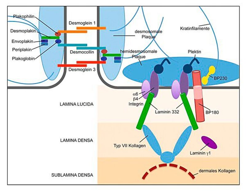Pemphiguserkrankungen sind generell durch eine intraepidermale/intraepitheliale Blasenbildung charakterisiert. Pemphigoiderkrankungen und Dermatitis herpetiformis Duhring zeigen histologisch eine subepidermale Spaltbildung [Schmidt and Zillikens, 2011]. Pemphigus-Antikörper sind gegen desmosomale und Pemphigoid-Antikörper gegen hemidesmosomale Strukturproteine von Haut- und Schleimhäuten mit geschichtetem Plattenepithel gerichtet (Abbildung 1). Dagegen erkennen die Autoantiköper bei der Dermatitis herpetiformis Duhring, die die kutane Manifestation einer Zöliakie darstellt, die Enzyme Transglutaminase 3 (epidermale Transglutaminase) und Transglutaminase 2 (Gewebstransglutaminase) [Sardy et al., 2002; Schmidt and Zillikens, 2011; Schmidt and Zillikens, 2013] (Tabelle 1).
