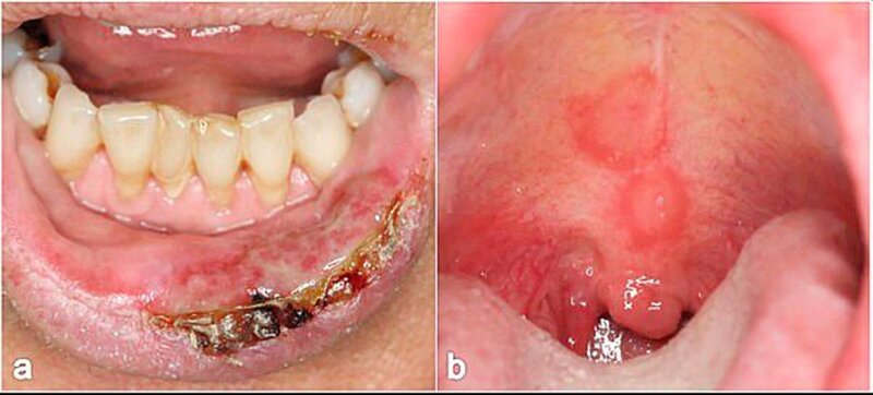 Beim Steven-Johnson-Syndrom handelt es sich um eine Unverträglichkeitsreaktion auf Medikamente oder – selten – um eine Hypersensitivitätsreaktion im Rahmen von Infekten, die mit ausgeprägten Erosionen der Mundschleimhaut und Lippen einhergeht. Die Diagnosestellung des Erythema exsudativum multiforme und Steven-Johnson-Syndroms erfolgt mittels Anamnese (Medikamente, Infektionen) und Histologie.