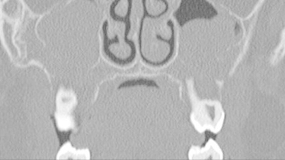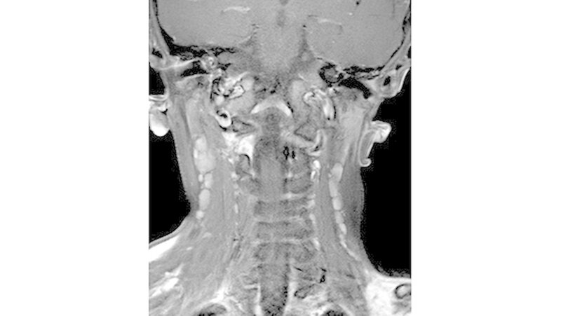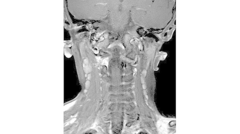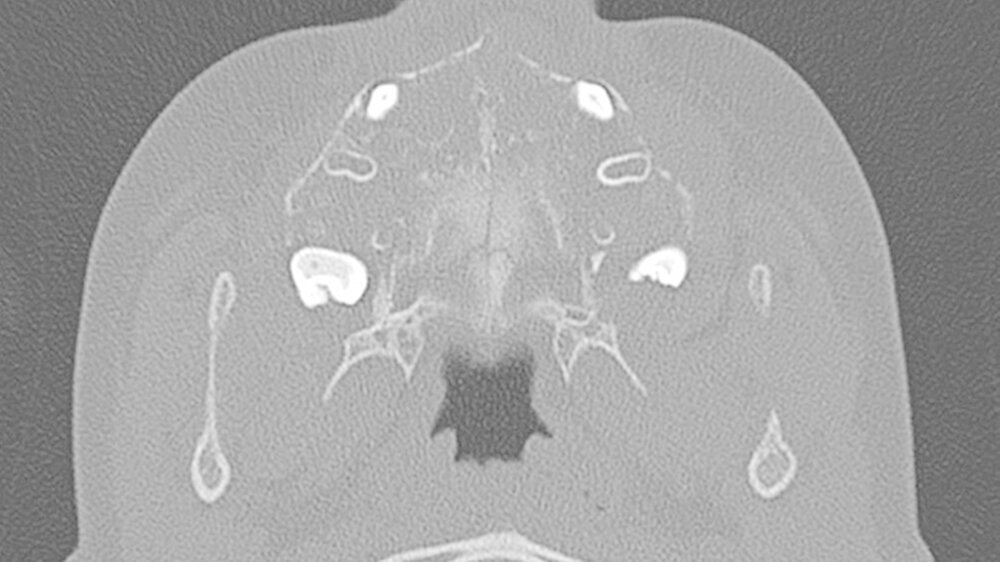 Da die konventionelle Röntgenuntersuchung keinen wegweisenden Befund zeigte, wurde die bildgebende Diagnostik um eine Dünnschicht-Computertomografie (HR-CT) des Mittelgesichts, eine Magnetresonanztomografie (MRT) des Kopf-Hals-Bereichs und eine Halssonografie erweitert.