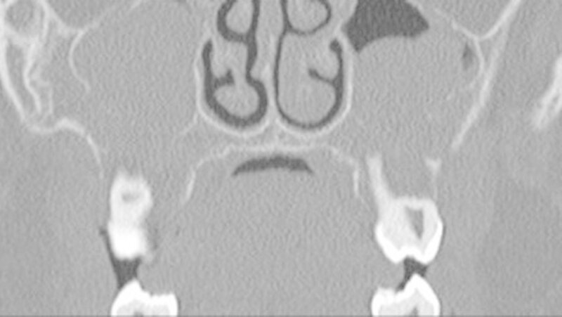 In der HR-CT zeigten sich Arrosionen am Oberkiefer und Kieferhöhlenboden sowie eine irreguläre Knochenbinnenstruktur mit Rarefizierung der Kochentrabekel und Demineralisation im Mittelgesichtsbereich, weiterhin eine Verschattung der Kieferhöhlen beidseits (Abbildungen 2 und 3).