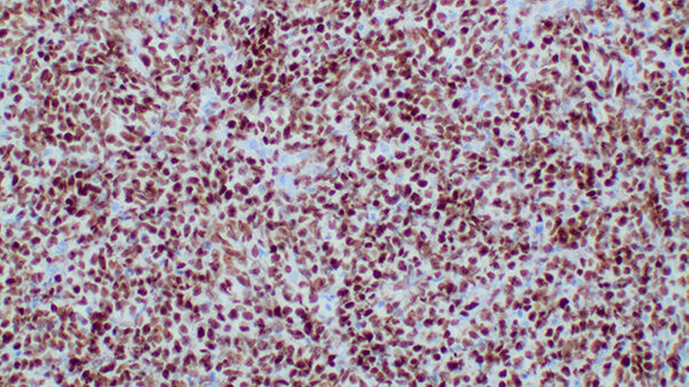 Der immunhistochemische Nachweis einer positiven Reaktion auf CD20 und c-myc (Abbildung 6) sowie die hohe Proliferationsfraktion (MIB-1) von über 90 Prozent führten zur Diagnose eines aggressiven Non-Hodgkin-Lymphoms der B-Zell-Reihe.