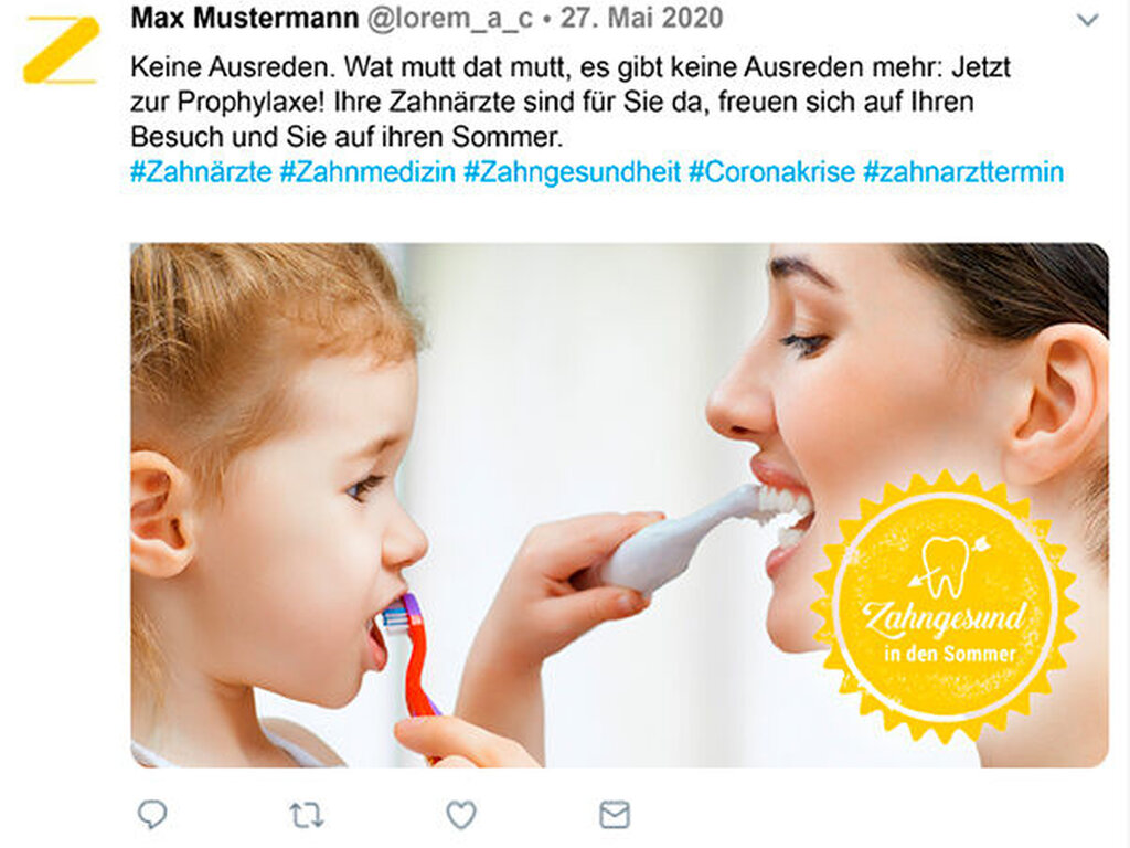 Mit dem Titel "Zurück in die Praxis" sind Postings für Social-Media-Kanäle erstellt worden, die die Patienten motivieren sollen, die verschobenen zahnmedizinischen Behandlungen und Vorsorgeuntersuchungen wieder wahrzunehmen. Diese sollen der Inspiration dienen und können auf der Website der BZÄK heruntergeladen werden. Zahnärzte, die nicht selbst posten möchte, können die Beiträge gerne teilen, heißt es.