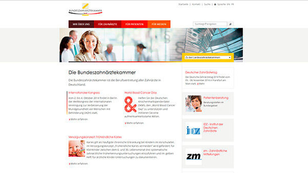 DieWebsitezeichnet sich nicht nur durch ein modernes, luftiges Design aus - die User können sich aufgrund der benutzerfreundlichen Navigation auch schnell auf der Seite orientieren; zudem wurden die umfangreichen Inhalte übersichtlicher für die unterschiedlichen Zielgruppen - Zahnärzte, Patienten und Medien - aufbereitet.