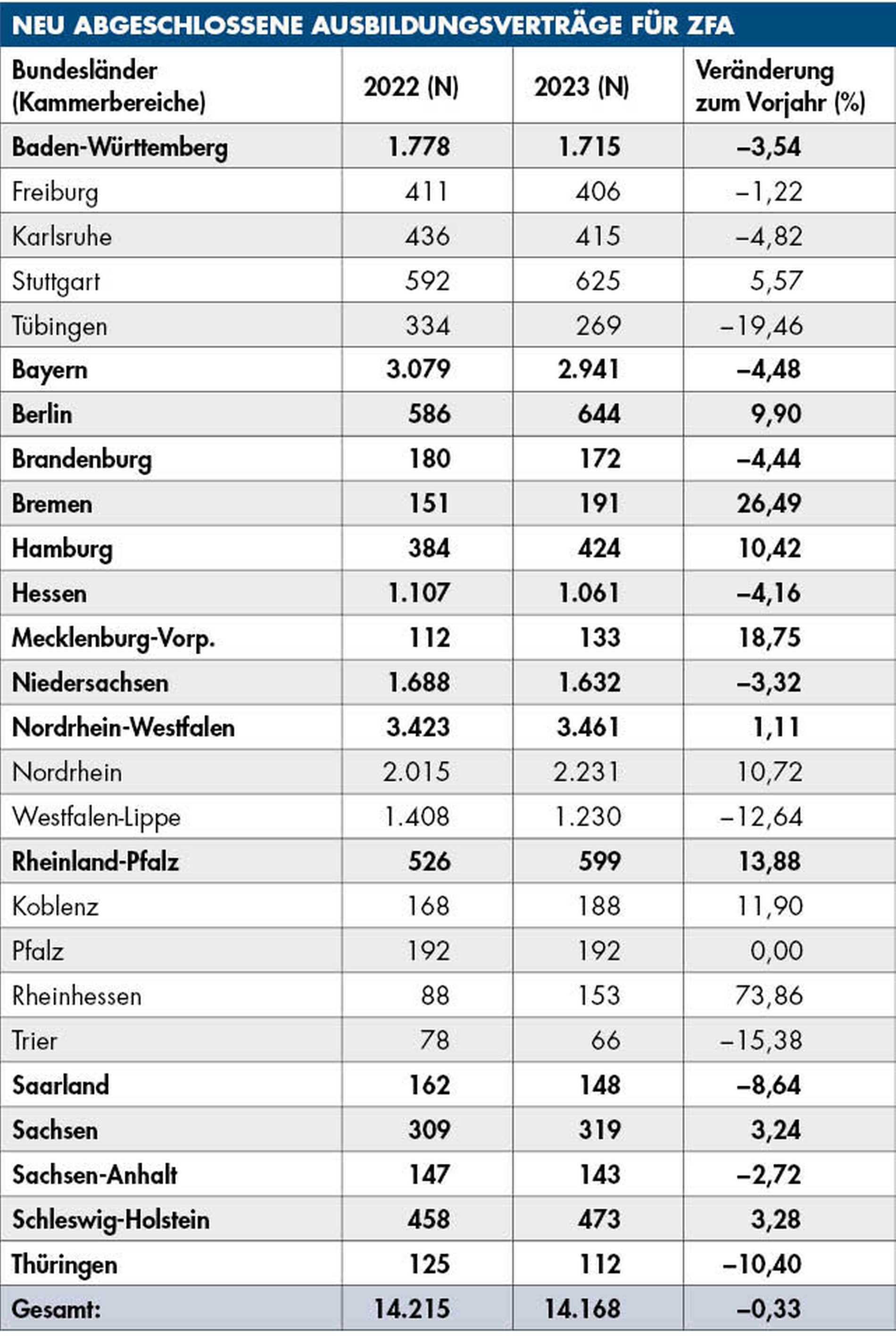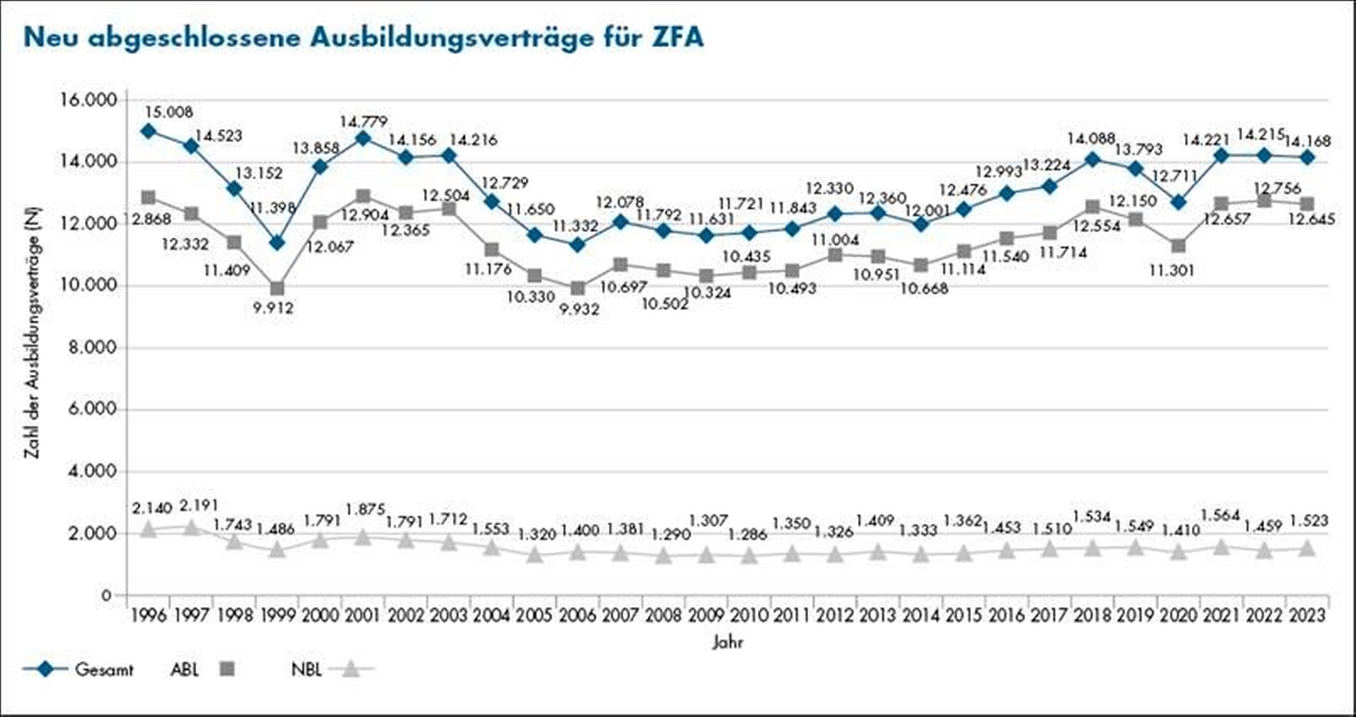 14.168 neu abgeschlossene Ausbildungsverträge zur ZFA zum 30.09.2023 (alte Bundesländer: 12.645, neue Bundesländer: 1.523): Das ist ein Minus von 0,33 Prozent gegenüber dem Vorjahr (alte Bundesländer: -0,87 Prozent, neue Bundesländer: +4,39 Prozent).