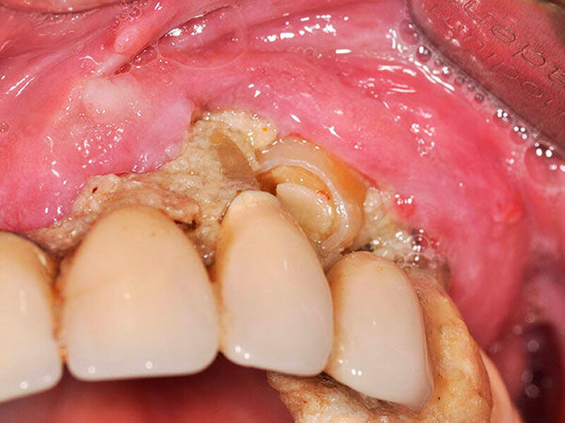 In der durchgeführten radiologischen Diagnostik zeigten sich ausgeprägte Parodontopathien mit Verdacht auf eine BRONJ bei gut begrenzter radiologischer Aufhellung mit Kieferhöhlenbeteilung (Abbildungen 3 bis 5). Unter der Verdachtsdiagnose einer BRONJ wurde somit die Indikation zur Zahnsanierung mit Exzision der pathologischen Veränderung im Oberkiefer gestellt. Nach Entfernung der gelockerten Brücke zusammen mit den die Brücke tragenden Zähnen zeigten sich große Mengen harten, anhaftenden Gewebes (Abbildung 6); der unter dem Befund liegende Knochen stellte sich klinisch als vital und ohne Anzeichen einer Nekrose dar.