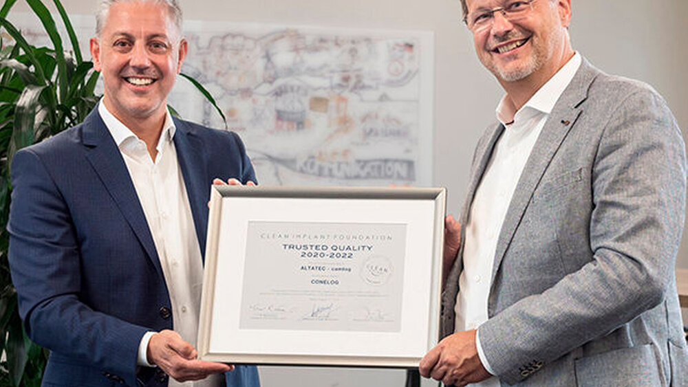 Die CleanImplant Foundation, Berlin, überreichte Camlog Geschäftsführer Martin Lugert das Zertifikat „Trusted Quality 2020 – 2022“ für das CONELOG Implantatsystem.