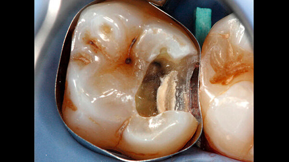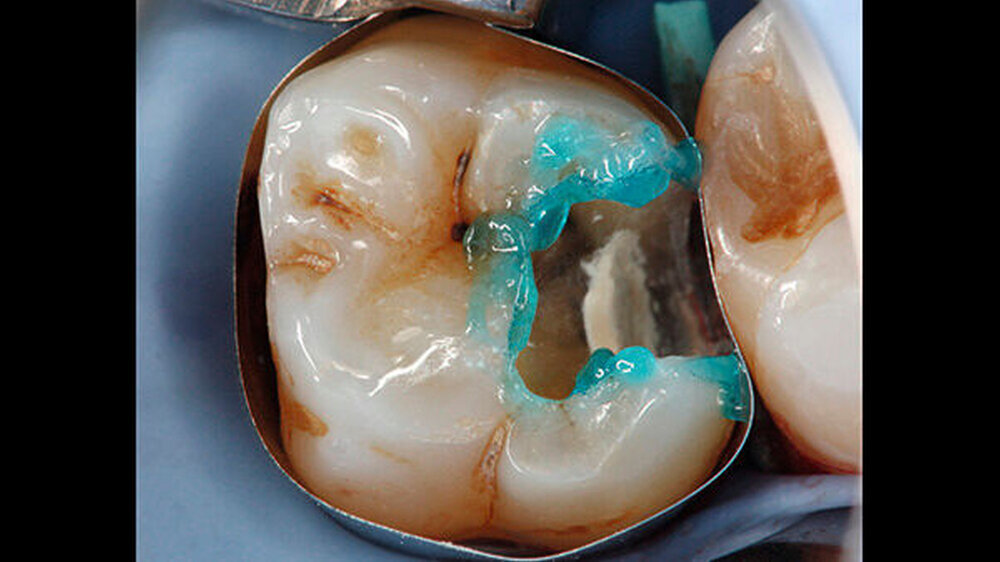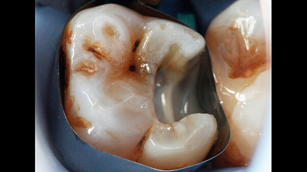 Bei der vollständigen Kariesentfernung kam es nicht zu einer Freilegung der Pulpa (Abbildung 3). Anschließend wurde eine Metallmatrize (HaweTofflemire Matrize, Kerr Dental) angelegt und verkeilt. Die Kavität wurde gereinigt und getrocknet.