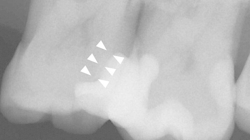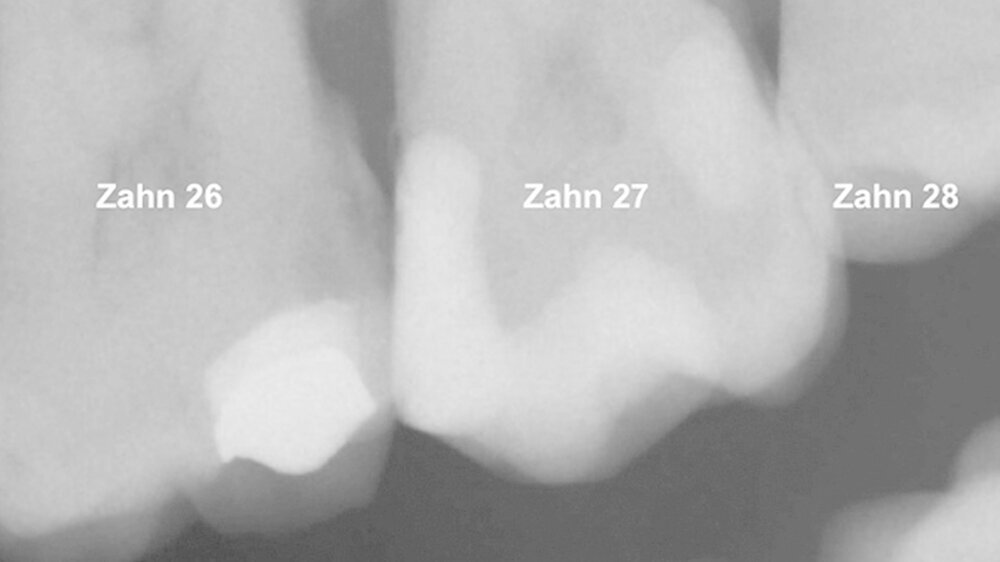 Ein 72-jähriger Patient stellte sich im Oktober 2013 zu einer Routinekontrolle in der Poliklinik für Zahnerhaltung und Parodontologie der Universität Regensburg vor. Bei der Befunderhebung wurde aufgrund des Verdachts auf Approximalkaries eine Röntgenaufnahme im Bereich des zweiten Quadranten angefertigt. Im Bereich des Zahns 26 distal wurde eine "Caries profunda“ diagnostiziert (Abbildung 1) und daher ein Termin zur Füllungstherapie vereinbart.