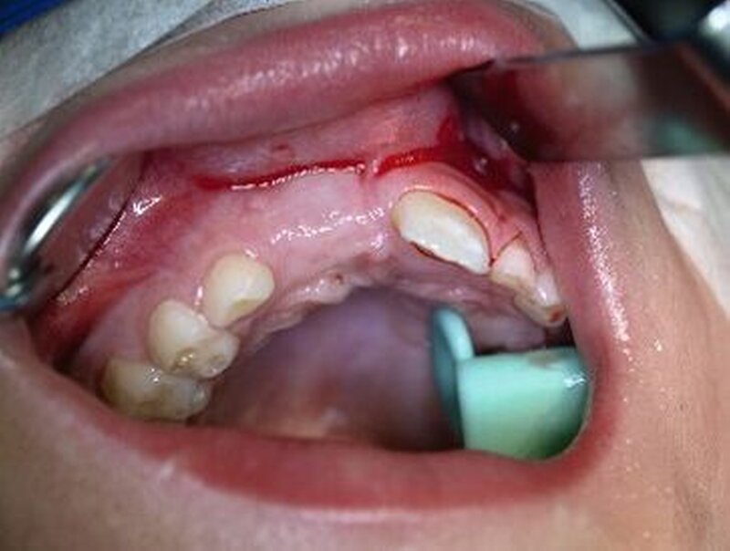 Die Versorgung einer Lücke mit Zahnimplantaten nach einem dentalen Trauma wird in der Regel nach Abschluss des pubertären Wachstumsschubes erwogen oder besser noch ins frühe Erwachsenenalter verlegt. Wenn zu diesem Zeitpunkt keine Sofortimplantation zusammen mit der Zahnwurzelextraktion erfolgt, sollte die Möglichkeit der Ridge preservation geprüft werden. Wenn eine Versorgung mit Zahnimplantaten erfolgt, dann nicht in der Akutphase des Traumas, sondern nach Abheilung der Weichteilwunden und der direkten allgemeinen Traumafolgen (Abbildung 5).