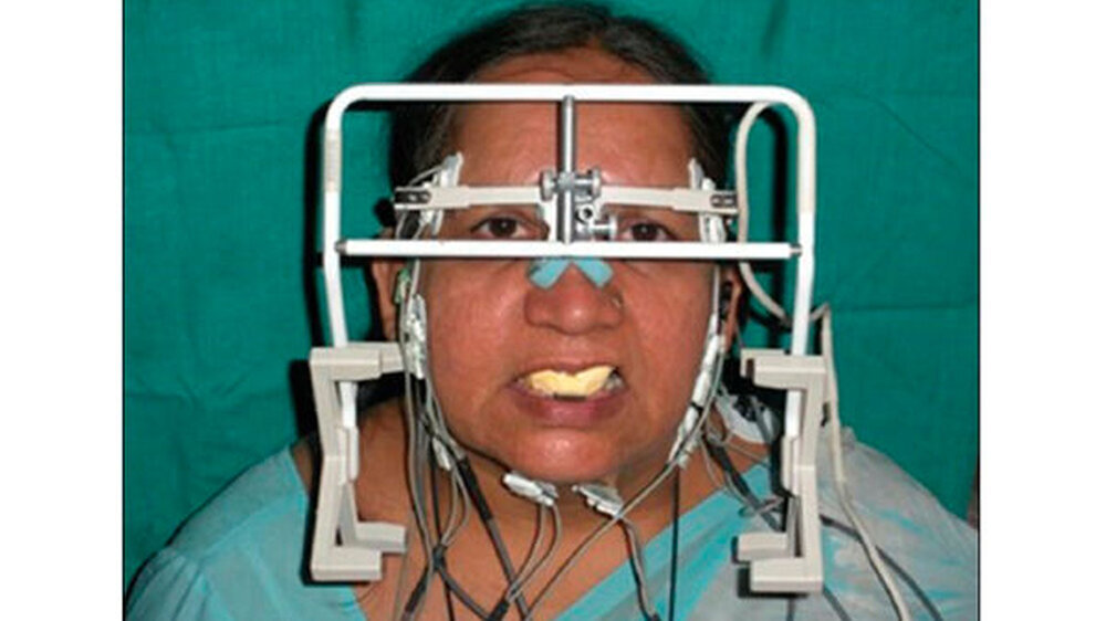Mithilfe der Transkutanen elektrischen Nervenstimulation (TENS), einer elektromedizinischen Reizstromtherapie, wurde eine vollständige Entspannung der Kiefergelenkmuskulatur erreicht, was den Unterkiefer in eine physiologische Position brachte. Drei Elektroden wurden verwendet - positiv, negativ und eine Masse-Elektrode. Die positiven und negativen Elektroden wurden in der Kiefergelenkszone vor dem Ohr angelegt, die Erdungselektrode wurde mittig am Hals angebracht. Die Stärke des TENS wurde allmählich erhöht, um Muskelkontraktionen zu erzielen. Der klinische Schwellwert für den Patientin lag bei 5 mV. An dieser klinischen Schwelle wurde eine die 45 minütige Muskelrelaxation durchgeführt.